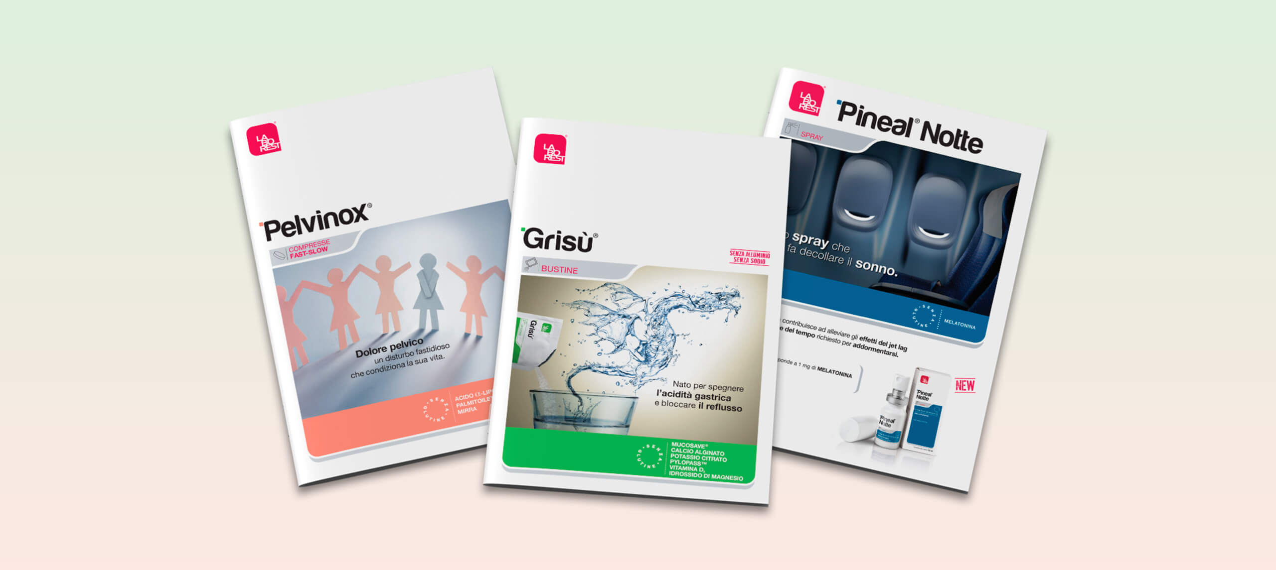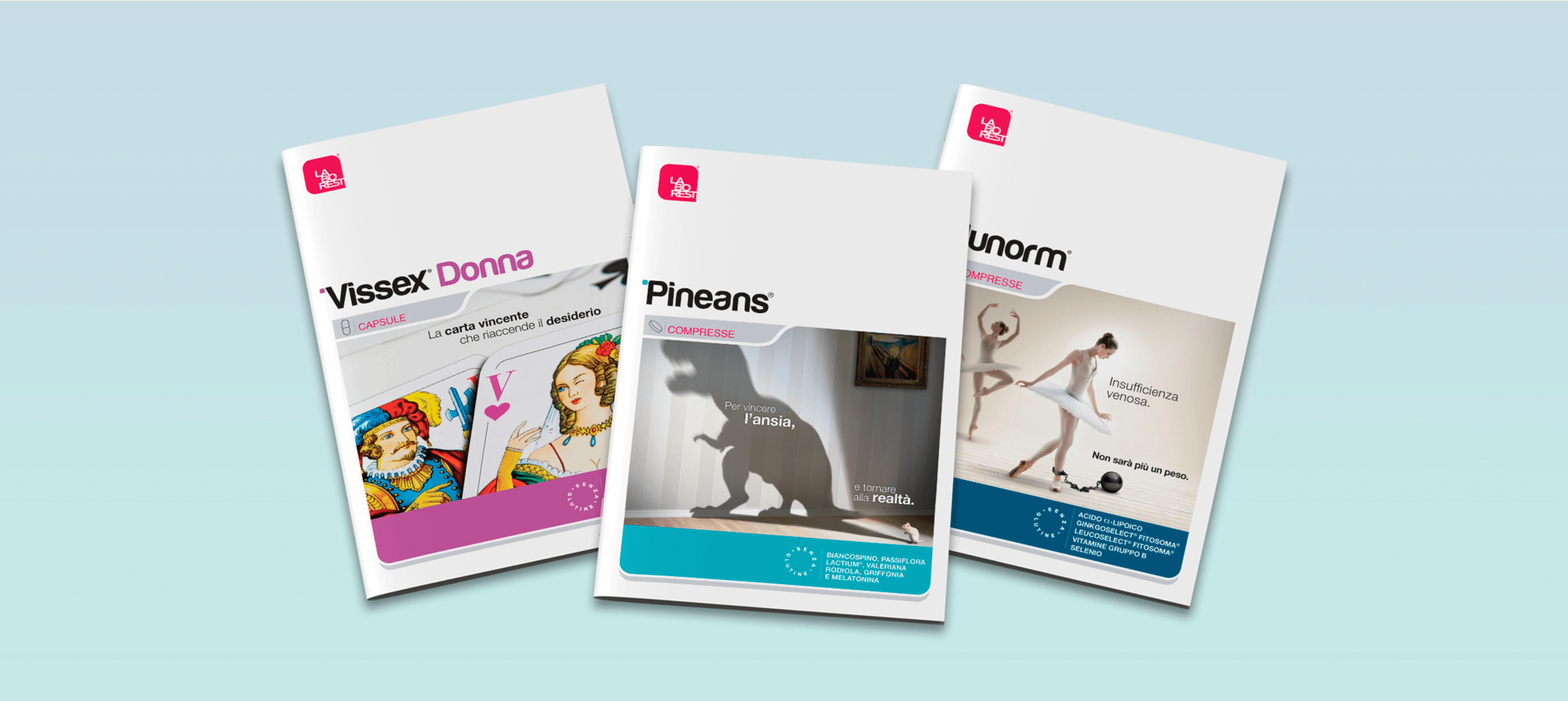 Per le immagini delle copertine dei folder di informazione medico-scientifica abbiamo optato per immagini molto creative e metaforiche. Ciascuna immagine doveva essere associata al sintomo o al beneficio del prodotto, e questo doveva, nei nostri piani, avvenire in modo inconscio: immagine ed emotività dovevano essere immediatamente riconducibili al nome del prodotto, perché memorizzare per immagini è sempre un’operazione che avviene istintivamente nel nostro cervello.