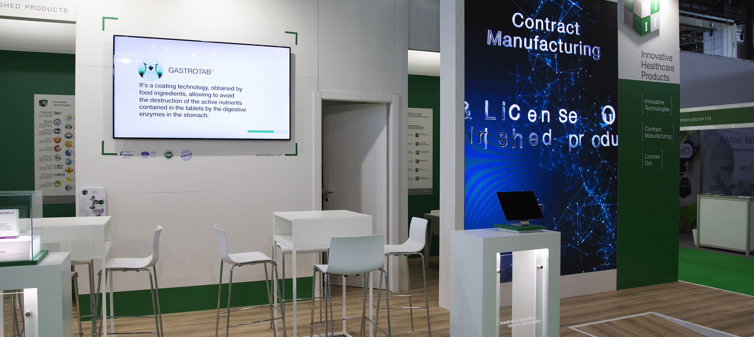 Abbiamo curato lo stand istituzionale per i maggiori eventi internazionali del settore, come Vitafoods e CPHI. Per lo stand, oltre all’allestimento grafico, abbiamo realizzato dei video tutorial per il corretto uso di alcune soluzioni per la somministrazione dei farmaci.